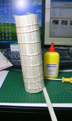 | なんとか許せる筒ができました。 木質粘土に木工用ボンドを練りこんだもので角棒の隙間を埋めた構造ですが、強度的にも問題はなさそうです。 |